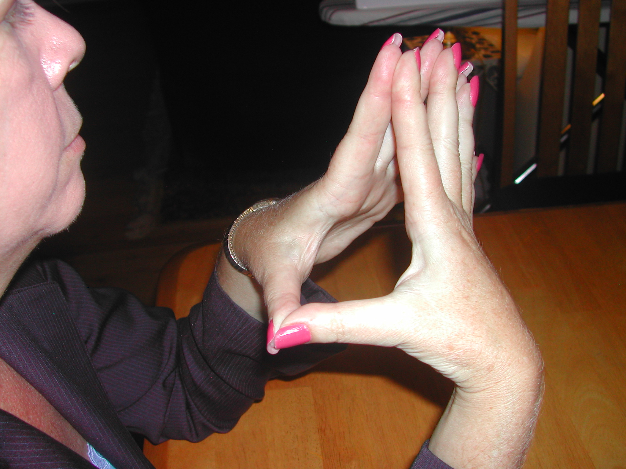 *If you’re sitting at a table, and you steeple your fingers, this can exude power and confidence. However, you have to be careful with this, because fingers in a “gun steeple” can indicate aggressive behavior.